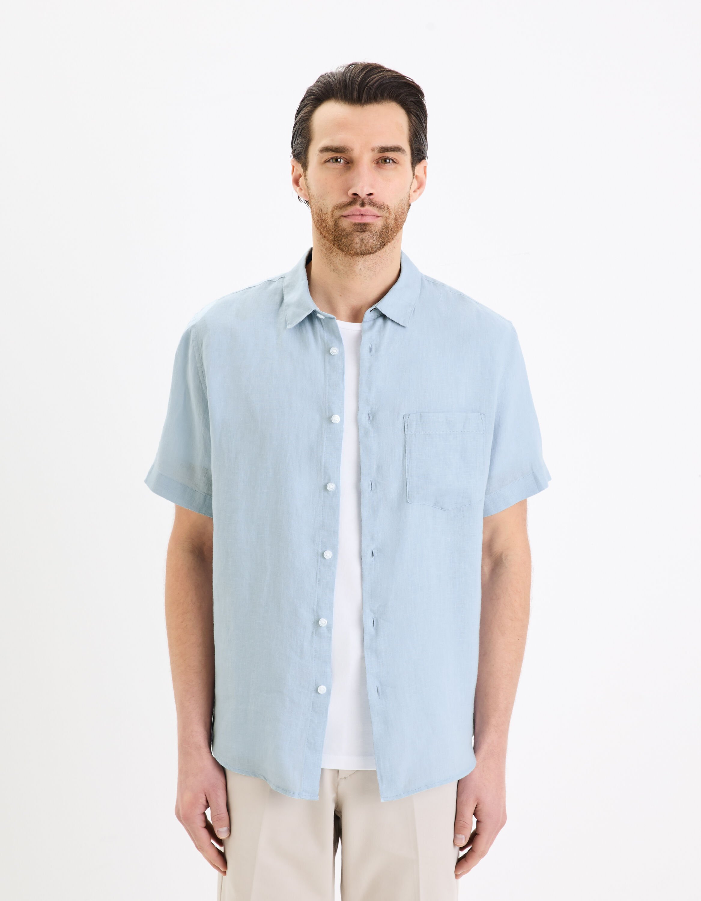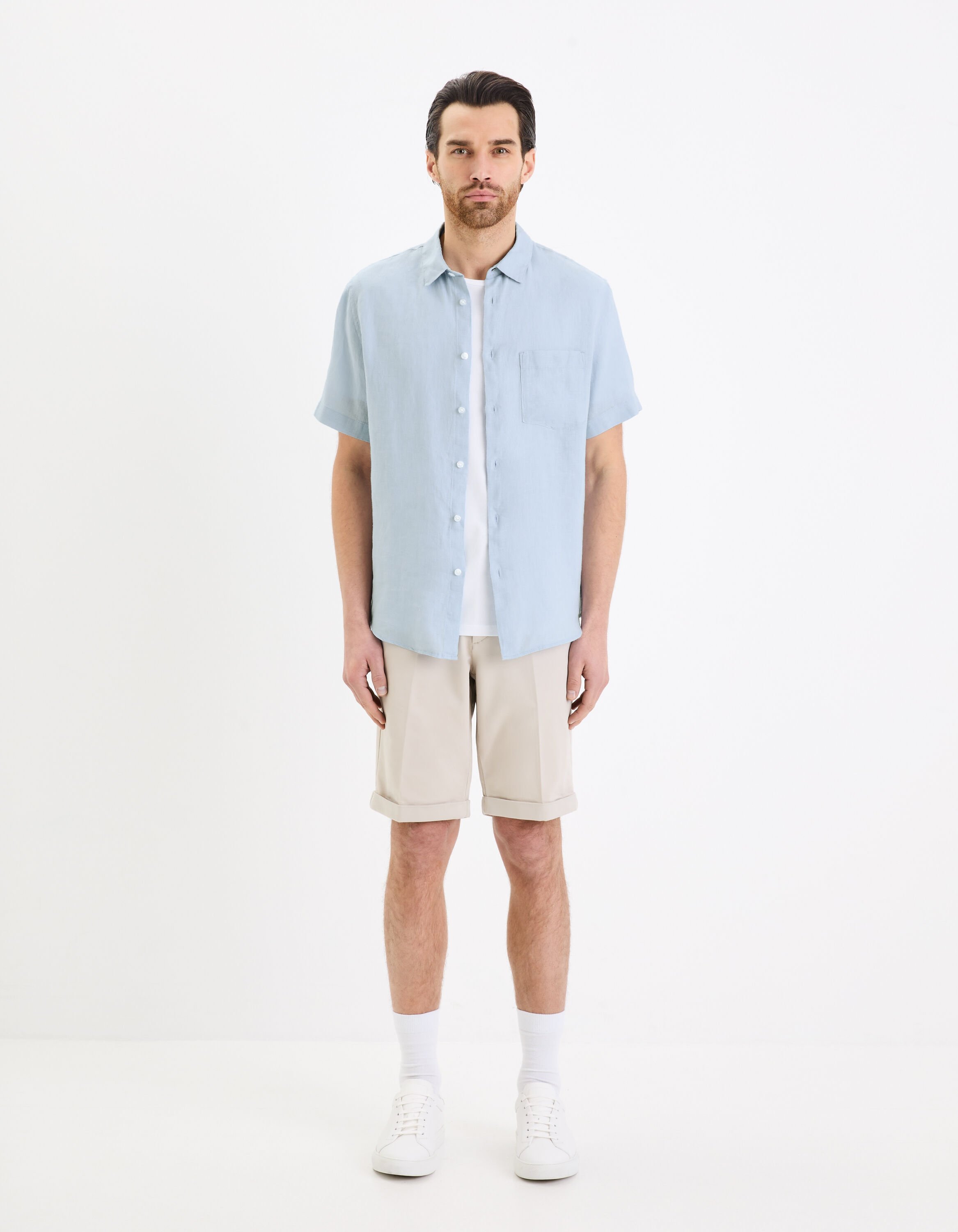 La légèreté de cette chemise homme 100% linà manches courtes accompagnera facilement un bermuda comme un pantalon en toile.